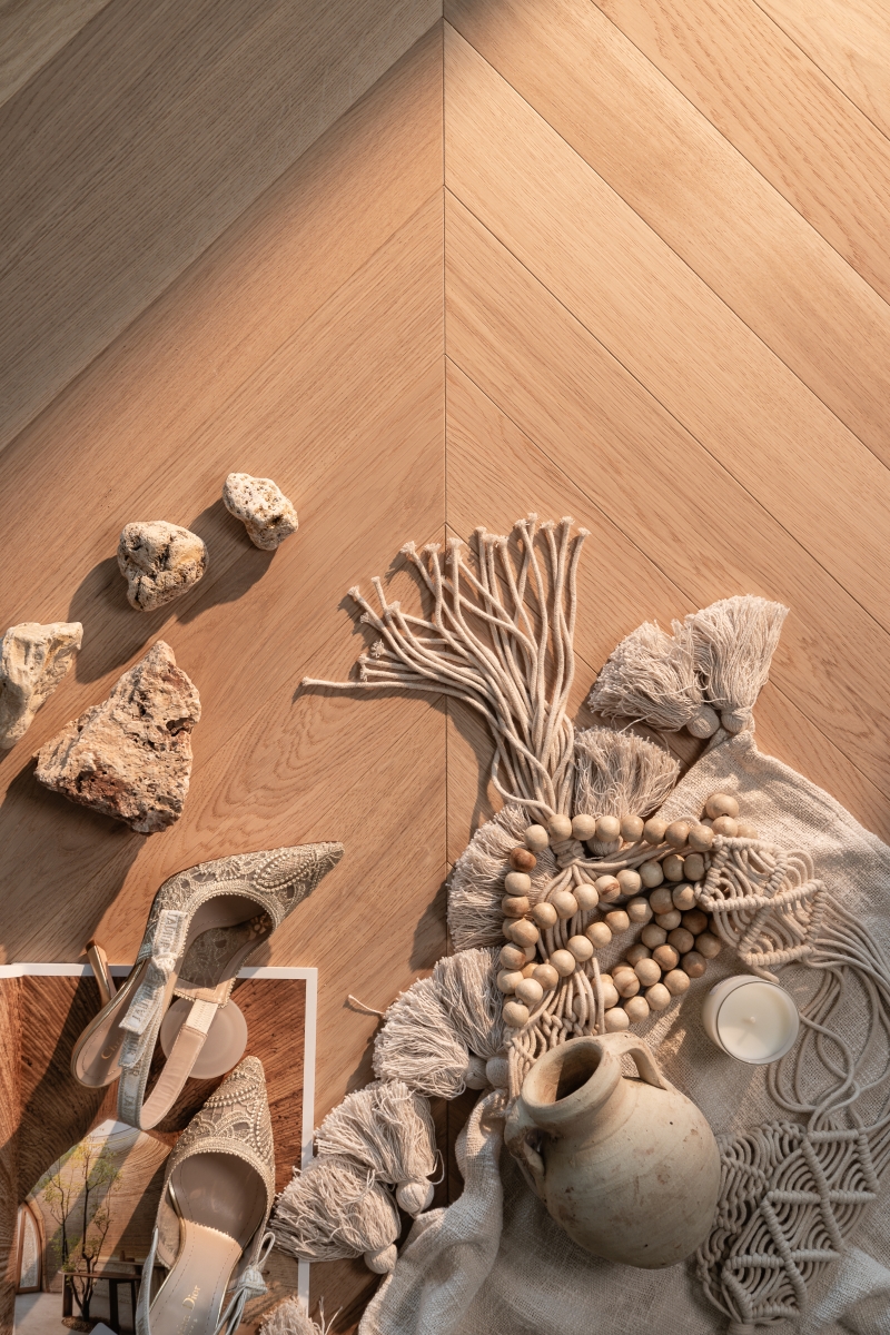 Šis divslāņu parketa grīdas segums papildina minimālistiskus interjerus, radot siltumu un dabiskumu, kas dažkārt pietrūkst skarbajās modernajās telpās. Tā gaišā, siltā krāsa skaisti sader ar baltu, pelēku un dabīgu koku, radot mājīgus un mierīgus interjerus, kas saglabā minimālisma raksturu.